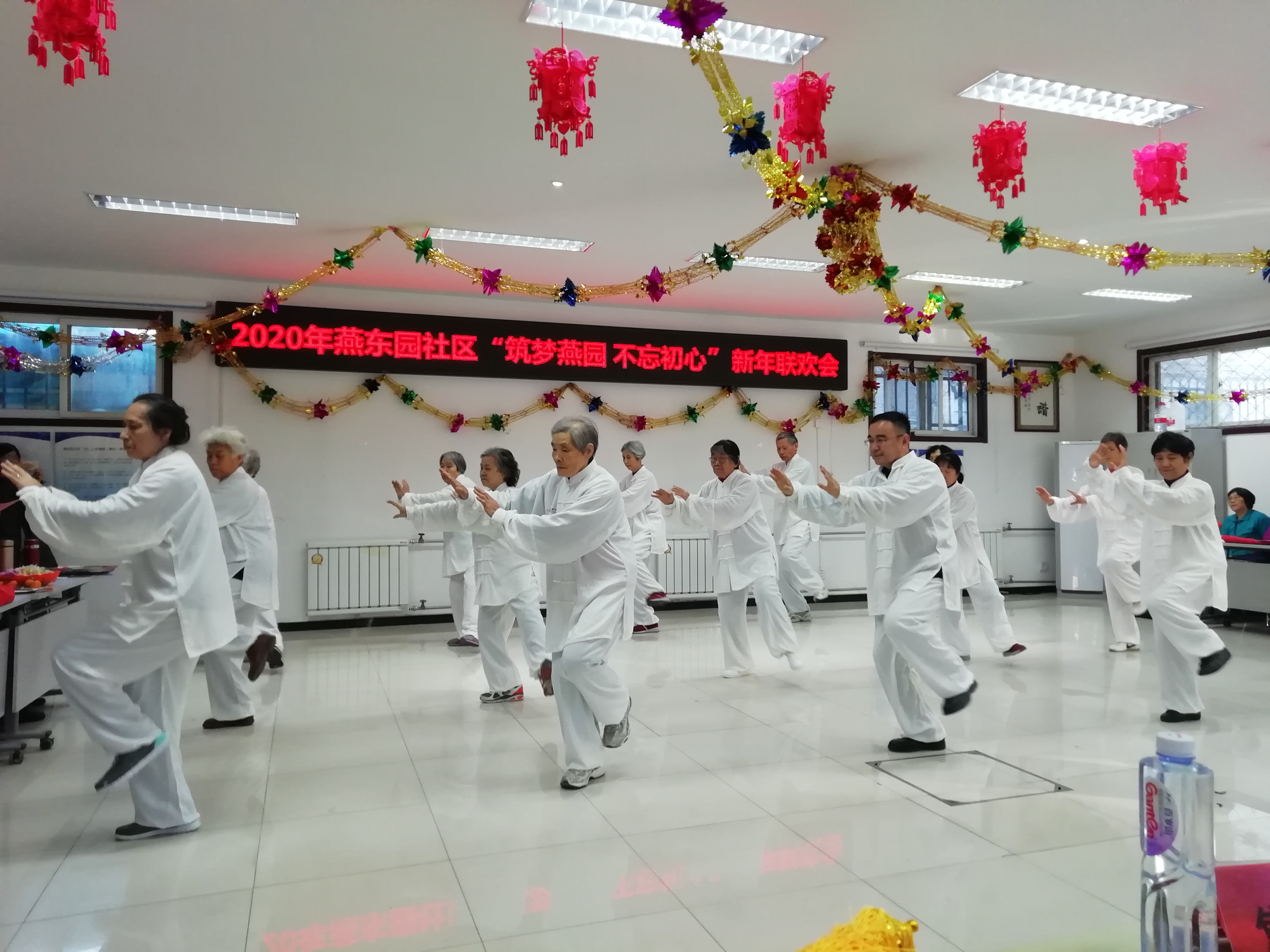 活动以大合唱开场,由燕东园合唱队带来《再唱山歌给党听》、《我们的中国梦》。歌声嘹亮悦耳,展现了社区居民饱满的精神面貌。太极拳队向焦玉珍献上了锦旗“我们的自家人”,代表了太极拳队全体队员的感谢之情。并邀请杨学祥和修亚冬一起和老年人们打拳,把太极拳进社区深入贯彻落实。接着表演了健身舞蹈、模特、舞蹈、柔力球等等高质量、高水平的节目,奉献给社区居民。