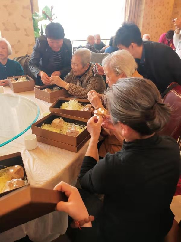致辞结束后,非遗专家带领侨界老人们进行了一场别开生面的智力大比拼。学生志愿者、社工志愿者们为老人们发放三种榫卯结构的鲁班锁,分别是好汉锁、鲁班球、笼中取珠。专家请老人们按由易到难的顺序尝试拆装,老人们先各自钻研拆装方法,再互相帮助,共同拆装。经过一段时间的尝试,专家开始向老人们讲解鲁班锁的具体拆装方法,老人们再次尝试遇到困难时,志愿者们上前一对一讲解,现场其乐融融。手工活动结束后,志愿者们为老人们送上香礼,老人们共进午餐,畅叙燕园情,共庆重阳日。