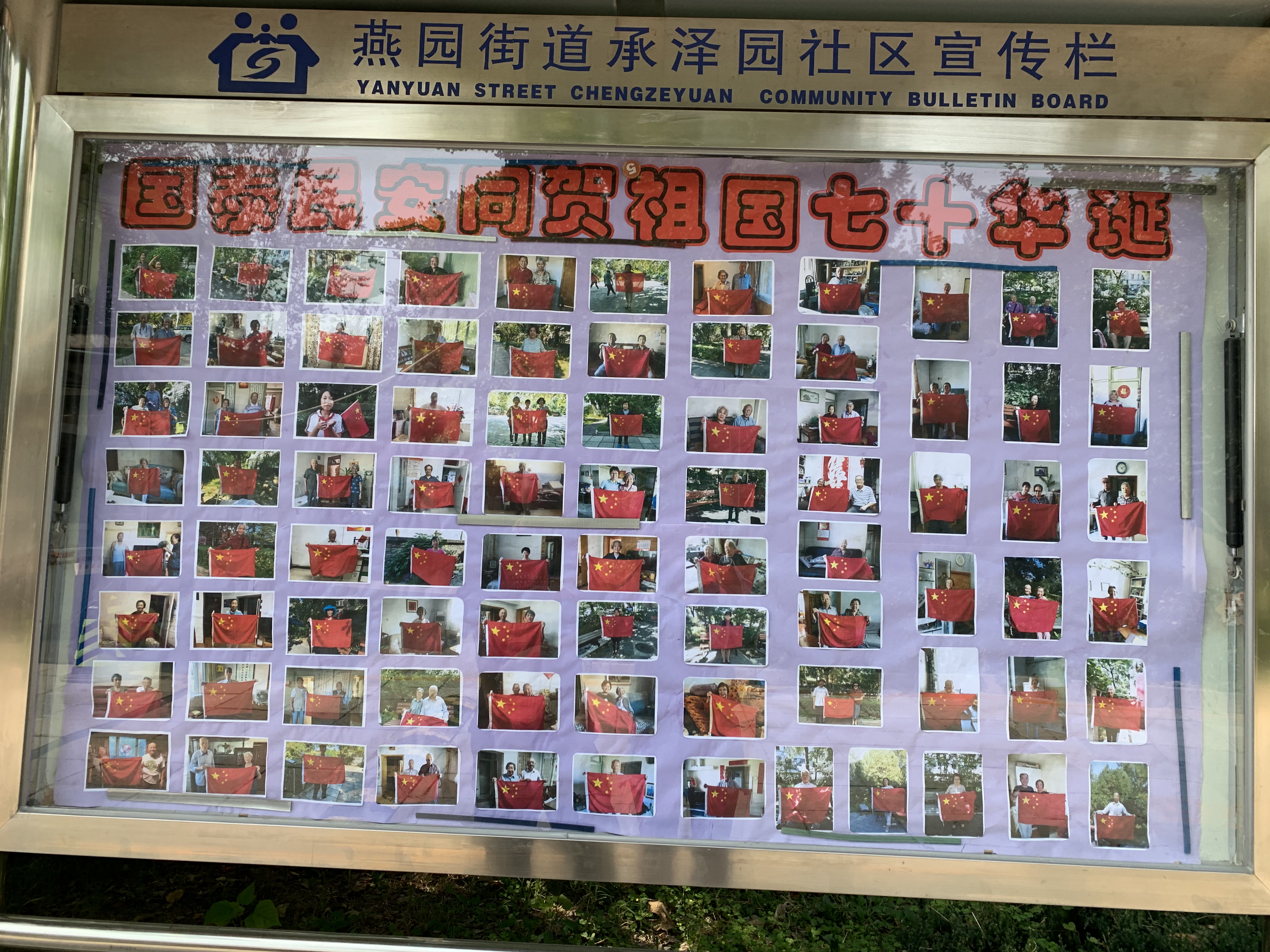 居民们的祝福语贴满了“我和国旗同框”大型展板,悬挂在社区宣传栏。照片中,与国旗同框的每位居民脸上都洋溢着灿烂的微笑,同时烘托出节日的欢乐气氛,活动受到广大居民的拍手称赞。