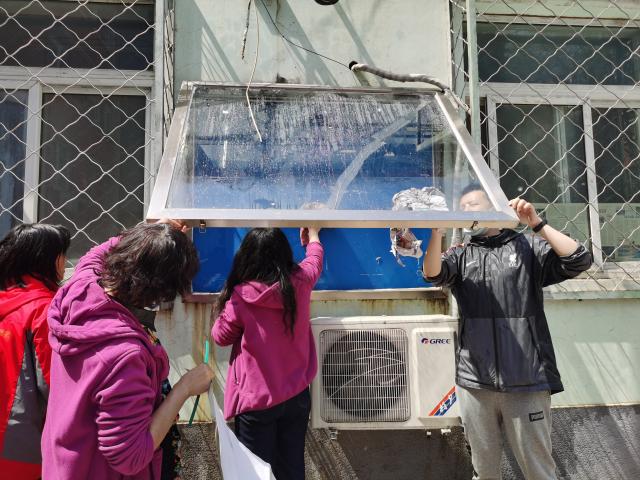 首先利用喷水枪大面积冲洗,然后拿着布、水桶、铲刀、钢丝球、除胶剂等工具,认真地把宣传栏上的灰尘、胶带残留下来的印记都清理干净。尽管烈日炎炎,但大家不怕辛苦,顶着大太阳辛勤工作,经过一番忙碌之后,橱窗变得明亮通透、焕然一新。