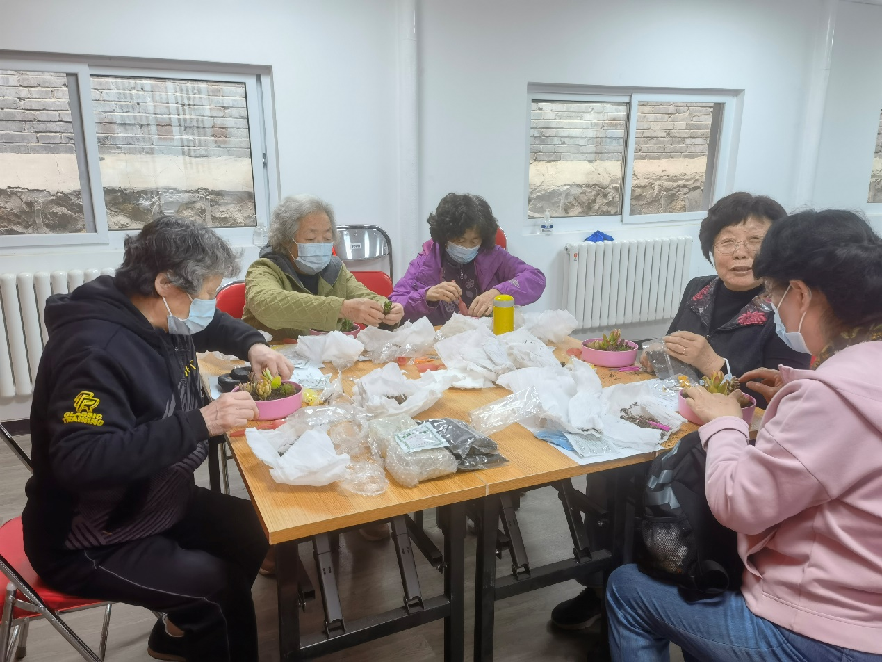首先是修根,志愿者会协助老人用剪刀或是镊子去掉干枯的根或是花叶;之后,将配套的营养土倒入盆中按压铺平;紧接着,老人需要用镊子等工具将修剪好的多肉放入土中进行种植;最后,参加活动的社区居民在土壤表面摆放石子或者摆件进行装饰。