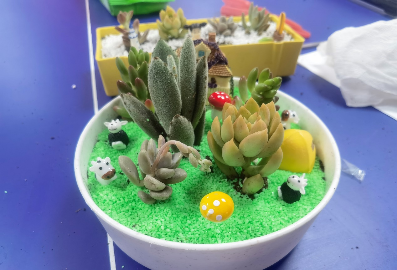 社区老人纷纷发挥各自的创意,根据多肉的大小、高度及种类合理排列布局,并利用多种颜色的石头和摆件装饰盆栽。老人之间一边交流一边种植,完成了多个精美的作品。志愿者及时观察并满足老年人的需求,细心解答其关于花卉种植及养护的问题,活动现场充满了欢乐的气息。活动结束后,社区老人纷纷拿着自己制作的绿植工艺品进行拍照留念。