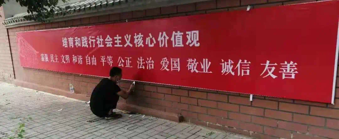 此次宣传展板更新更换的具体内容包括“文明守礼友善待人”、“谦诚雅信大道在公”、“以人为本共享自由”、“富国强民共筑和谐”等宣传标语以及社会主义核心价值观长条横幅。