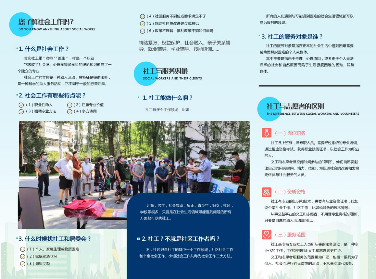 面对居民接踵而来的问题,工作人员耐心给予了解答,并递过宣传册,说道:“老师,这是我们制作的折页,您看这里面有详细的社会工作介绍,折页您可以拿回家,方便需要的时候浏览。另外,晚上请您关注我们的公众号,感兴趣可以参与有奖竞答”。