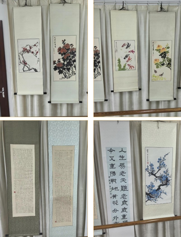 本次展览涵盖书法、摄影、绘画、手工等百余副作品,参展居民用笔墨与巧手展现出对生活的热爱。绘画展区内,一幅幅作品风格各异、意境深远。牡丹图色彩艳丽,尽显雍容华贵;梅花图笔触苍劲,勾勒出傲雪凌霜的风骨;金鱼图与花鸟春景图充满生机,金鱼摇曳、春鸟呢喃,仿佛将四季风光浓缩于方寸画卷之中。书法作品更是笔力千钧,字迹苍劲有力,展现出创作者深厚的笔墨功底。