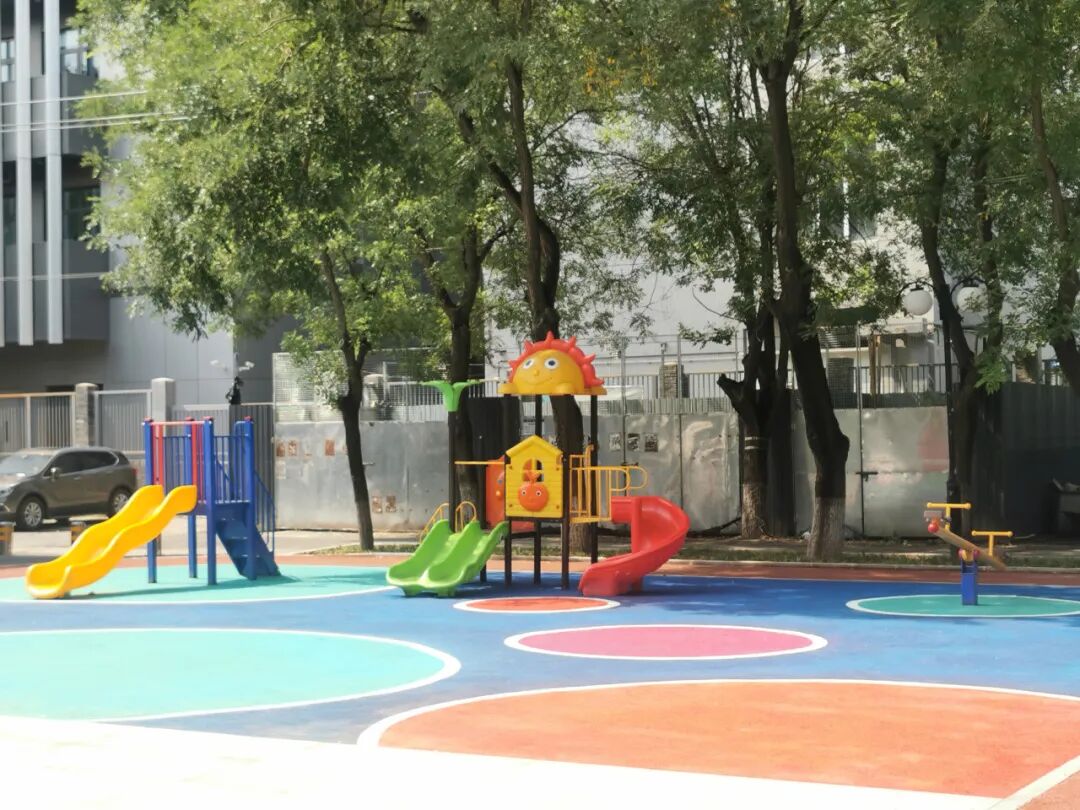 塑胶地面铺满儿童区,为滑梯、跷跷板等器材筑牢“安全垫”