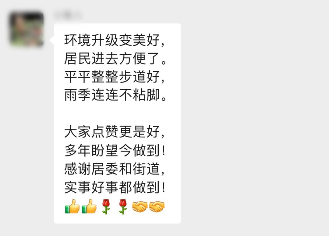 考虑到部分老师需要轮椅出行,还特意对单元出入口进行了优化,增设了平缓的无障碍通道,加装了结实的护栏,保障居民出行安全。当李老师的爱人推着轮椅,平稳地走过新改造的路面时,忍不住连连称赞:“这次改造做得非常好,用着特别方便,真是太感谢社区和街道了!”园区老住户栗老师更是难掩喜悦,特意创作了一首打油诗:“环境升级变美好,居民进出方便了。平平整整步道好,雨季连连不粘脚。大家点赞更是好,多年盼望今做到!感谢居委和街道,实事好事都做到!”